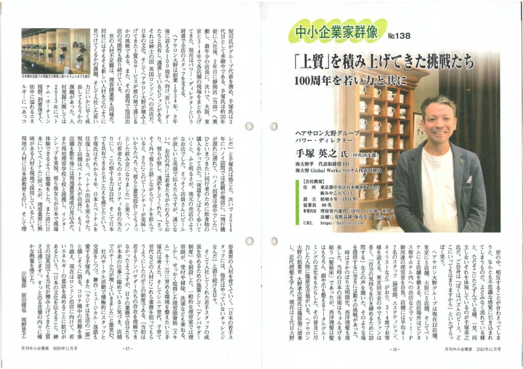 このたび、『月刊 中小企業家 2025年11月号』にて、ヘアサロン大野グループ(㈱大野孝)代表取締役 PD 手塚英之のインタビュー記事が掲載されました。