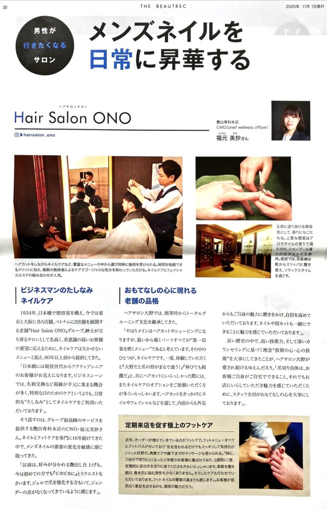 『THE BEAUTREC』2025年11月号に、ヘアサロン大野のメンズネイルへの取り組みが紹介されました。